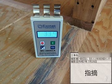 JASS(日本農林規格)の基準では、床合板は14%以下である。下記の数値では自然乾燥では工事完中に乾燥しない為、乾燥を促す処置(送風機やヒーター使用等)を取るように指示をした。