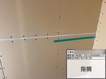 写真は、壁石膏ボードの継ぎ目部のビスが不足している状況。