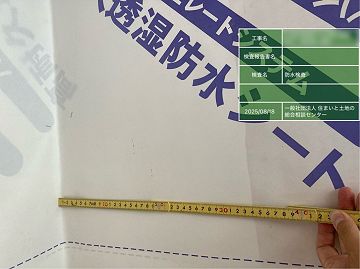 写真は各所、防水紙の重ね幅を確認している状況。
