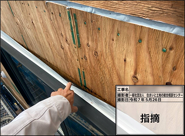 併せて、屋根ルーフィングなどの先行防水工事も確認したが、窓廻り防水テープの施工不良などを指摘した。