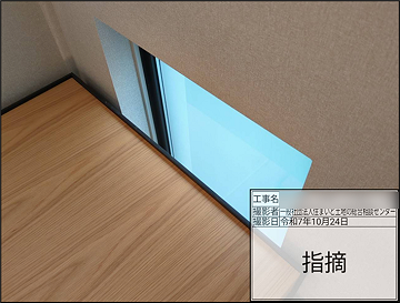 内部造作完了検査では、内部せっこうボードやフローリング、棚等造作の施工状況を確認した。三菱地所ホームは枠組壁工法のためせっこうボードが防耐火および構造上重要な役割を果たすが、一部施工状況不適部位があったため、是正を指示した。