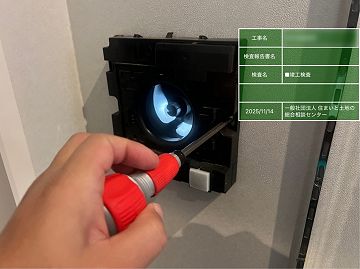 本検査では、各所固定ビスも確認するが、写真は、壁付け換気扇の固定ビス用のビスの空回り(下地に留まっていない)を確認した。