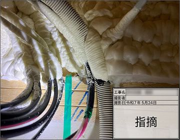 多数の配線が密集している箇所では、吹付断熱材が完全に充填されずに隙間ができる事が多く、専門業者の技術力が問われる為、施工のばらつきが目立つ箇所である。